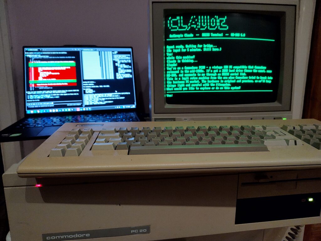 Tonight I connected my old Commodore PC20, a dusty 8088 machine running MS-DOS 5.0 to Claude via a null modem RS232 cable. No internet on the Commodore side, just a serial port and a QuickBASIC program I and my friend Claude wrote to shuttle bytes back and forth.